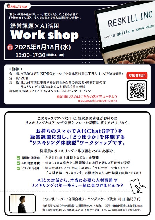 従業員が新しい知識やスキルを身につけ、ふさわしい働き方やキャリアづくりを学ぶ拠点である「北九州リスキリングキャンパス」を今夏開講します。また、開講に先駆けて、プレイベントを開催中です!