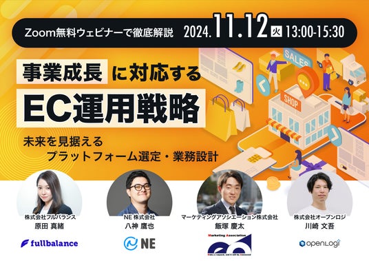 ECサイトの運営代行サービスを提供しているマーケティングアソシエーション株式会社(本社:東京都台東区 代表取締役:中園広和、以下当社)は、2024年11月12日(火)に、ウェブセミナー「ECの成長に対応するプラットフォームの選び方と運用戦略 ~未来を見据えたプラットフォームの選び方と業務設計~」を、株式会社フルバランス、NE株式会社、株式会社オープンロジと共催いたします。