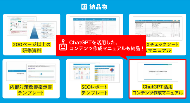 200ページ以上の研修資料、SEOチェックシート79項目、UI・UXチェックシート&マニュアル、内部対策改善指示書テンプレート、SEOレポートテンプレート、ChatGPT活用コンテンツ作成マニュアルを納品物としてお渡しします。