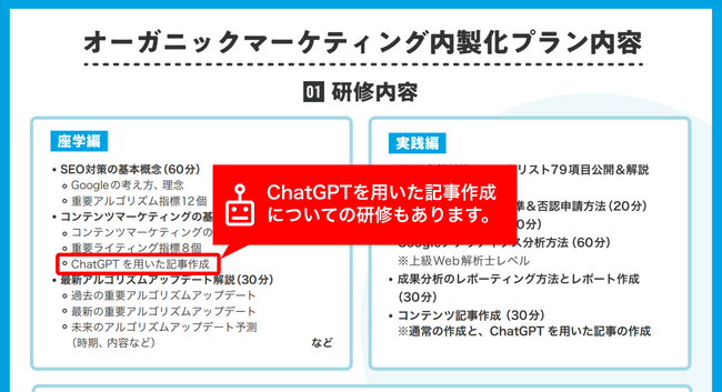 座学編として、SEO対策の基本概念、コンテンツマーケティングの基本概念(ChatGPTを用いた記事作成を含む)、最新アルゴリズムアップデート解説など。実践編として、SEO内部対策チェックリスト79項目公開&解説、SEO外部リンクNG基準&否認申請方法、各種分析ツール紹介、Googleアナリティクス分析方法、成果分析のレポーティング方法とレポート作成、コンテンツ記事作成(通常版とChatGPT版)などを研修でサポートします。