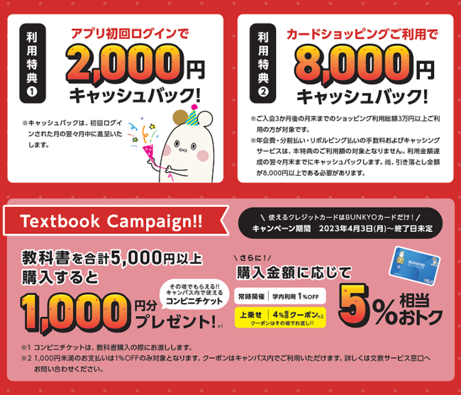教科書をおトクにご購入頂ける特典や、条件クリアで1,000円分のコンビニチケットをプレゼントいたします。