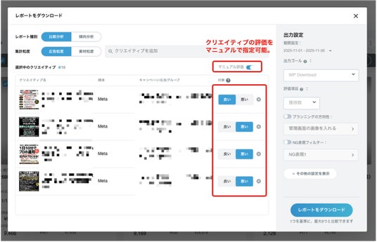 1.クリエイティブの評価を「良い」「悪い」で任意設定「マニュアル評価」モードをONにすることで、各クリエイティブに対して「良い」「悪い」の評価を自由に設定できます。媒体の自動評価とは異なる基準で、クリエイティブを分類して分析することが可能になります。