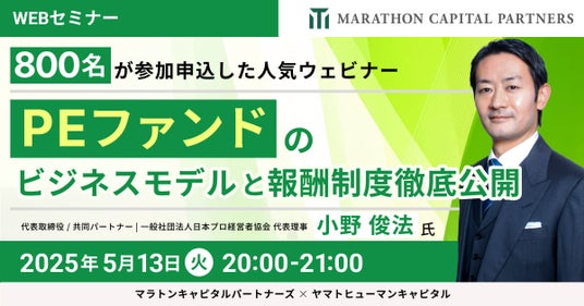 ヤマトヒューマンキャピタル株式会社(本社:東京都千代田区、代表取締役:堀江 大介)は、2025年5月13日(火) 20:00よりオンラインにて、マラトンキャピタルパートナーズ株式会社 代表取締役/共同パートナー/一般社団法人日本プロ経営者協会代表理事の小野 俊法氏にご登壇いただくウェビナー『PEファンドのビジネスモデルと報酬制度徹底公開』を開催いたします。