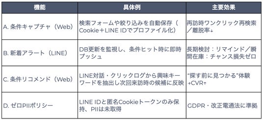 「Kaizen Personalize Agent」は、Web上での検索条件やLINE上でのAIエージェントの対話を “覚えて・知らせて・活かす”――WebとLINEの体験をつなぎ、ユーザーにピッタリの新着情報を即時届けることを実現するためのパーソナライゼーション基盤です。