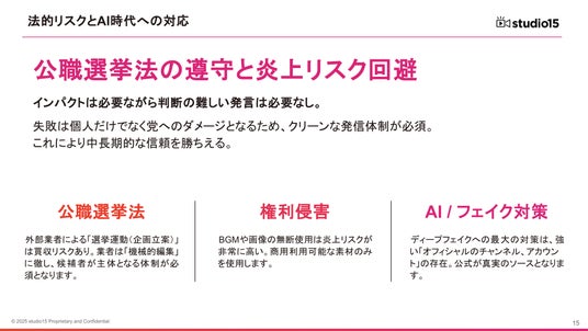 JIAA(日本インタラクティブ広告協会)やクリエイターエコノミー協会に加盟するstudio15の専門知見に基づき、法的・倫理的リスクを回避しながら、誠実な発信で有権者との信頼関係を築くための指針を提示しています。