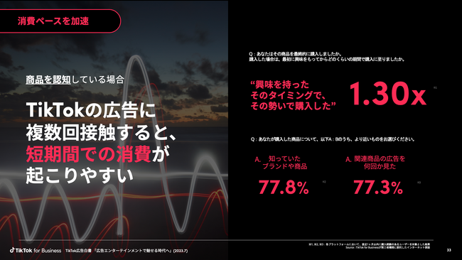 また、前述した生活者の情報ニーズと、TikTokの強みである「発見・セレンディピティがある」「没入感のある視聴体験」「短尺で消化しやすいコンテンツ」「等身大かつ複層的に情報を得られる」が合致しており、それを生かしたエンターテインメント体験が消費行動を加速しています。 結果として、商品を認知しているユーザーがTikTokの広告へ複数回接触すると、短期間での消費が起こりやすいことが調査によってわかっています。