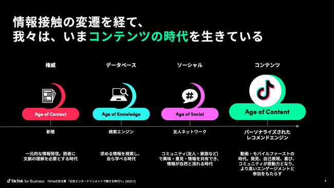 そして今は、TikTokの「おすすめ」フィードのように、パーソナライズされたレコメンドエンジンによって、情報が“コンテンツ”という形で生活者のもとへやってくる時代になっています。
