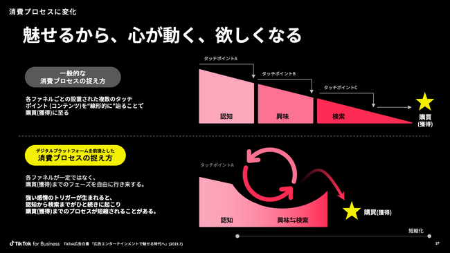 従来の一般的な消費プロセスは、「認知」「興味」「検索」という各ファネルを直線的に辿って「購買(獲得/DL)」に至りますが、新しい消費プロセスでは、「購買(獲得/DL)」までのフェーズを自由に移動します。 そこへ強い感情のトリガーが生まれると、認知から検索までがひと続きに起こり、購買(獲得/DL)までのプロセスが短縮されることがわかっています。