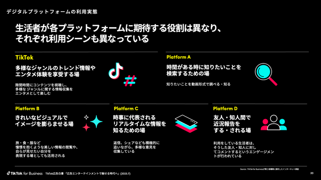 TikTok for Businessは、この度、デジタルプラットフォームの利用実態に関する調査結果をもとに、デジタル広告におけるTikTokが生み出す効果についてまとめた「TikTok広告白書 ~広告エンターテインメントで魅せる時代へ。TikTokが消費プロセスを変革する理由とは?~」(2023.7)をTikTok for Businessとして初めて発表しました。 資料ダウンロード:https://tiktok-for-business.co.jp/download/tiktok-advertising-whitepaper