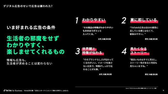 その他の詳細については、「TikTok広告白書 ~広告エンターテインメントで魅せる時代へ。TikTokが消費プロセスを変革する理由とは?~」(2023.7)にまとめています。 白書をご希望の方はTikTok for Business公式サイト(https://tiktok-for-business.co.jp)からダウンロードいただけます。