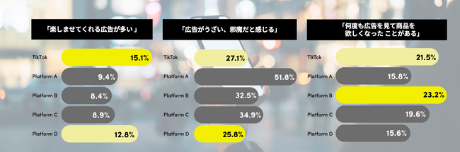 広告に対する意識もプラットフォームごとに違いがあり、TikTokの広告は「楽しませてくれる広告が多い」という回答が他プラットフォーム4社よりも高く、エンターテインメント性のあるものとしてユーザーに認識されています。そのため、「広告がうざい、邪魔だと感じる」という回答は3割以下となっており、広告に対する嫌悪感を抱きにくいということも明らかになっています。