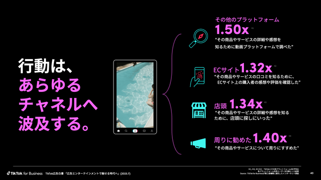 例えば、あるマーケティングミックスのキャンペーンの際に、TikTok以外のプラットフォームで認知施策を行う場合、TikTokでの投稿/広告を加えていただくことでユーザーの態度変容効果を高め、短期間での購買(申込/DL)へ導くことが期待できます。 (本資料内では、具体的な事例も掲載しています)