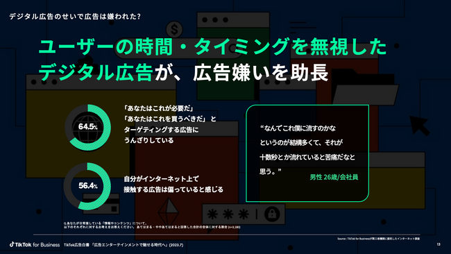 様々な調査レポートによって、生活者のデジタル広告への嫌悪感が表面化している中、その原因を探ったところ、デジタル広告は発信者側の都合を優先し、ユーザーの時間やタイミングを無視してしまったため、広告嫌いを助長していることが判明しました。