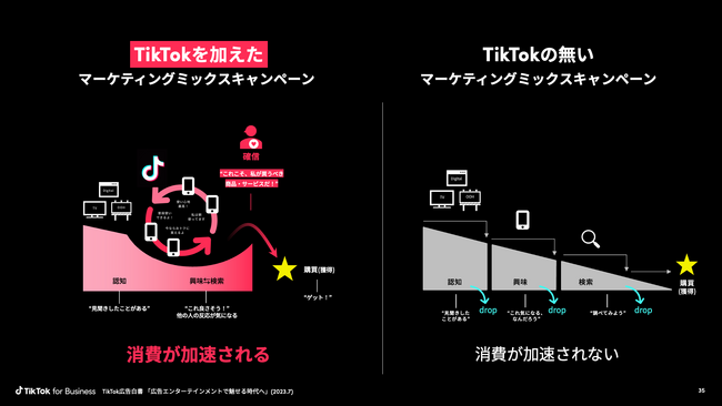 このように、TikTokは「消費のアクセラレーター」として機能し、「消費プロセスを加速」「自分ごと化を加速」という2つのインパクトをもたらします。そしてTikTokを活用することは、マーケティングミックス効果を高めることにもつながります。