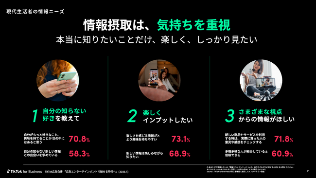 情報がやってくる時代の到来とともに、生活者の情報ニーズにも変化が起こっています。調査の結果、70.8%が「自分がもっと好きなこと、興味を持てることが世の中にはあると思う」と回答し、73.1%が「楽しさを感じる情報だとより興味を持ちやすい」と回答しています。このことから現代の生活者は、自分が本当に知りたいことだけを、楽しくインプットしたいというニーズを持っていることが明らかになりました。