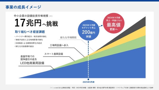 「ネクシーズZERO」の商材および販売業種は、商業・農業・工業とマーケットを拡大してまいりました。現在、中小企業の設備投資の市場規模は約17兆円あり、当社の成長余地となっております。