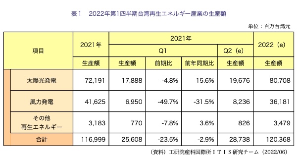 台湾太陽光発電産業の2022年第1四半期の生産額は178億9000万台湾元で、前期比4.8%減、前年同期比15.6%増となった。太陽光発電設備の駆け込み設置があった前期からの反動減と出荷先送りで前期比マイナスとなったが、太陽光発電の電力買い取り価格の引き上げにより、太陽電池、太陽光発電モジュールの需要が拡大し、前年同期比では2桁プラス成長となった。