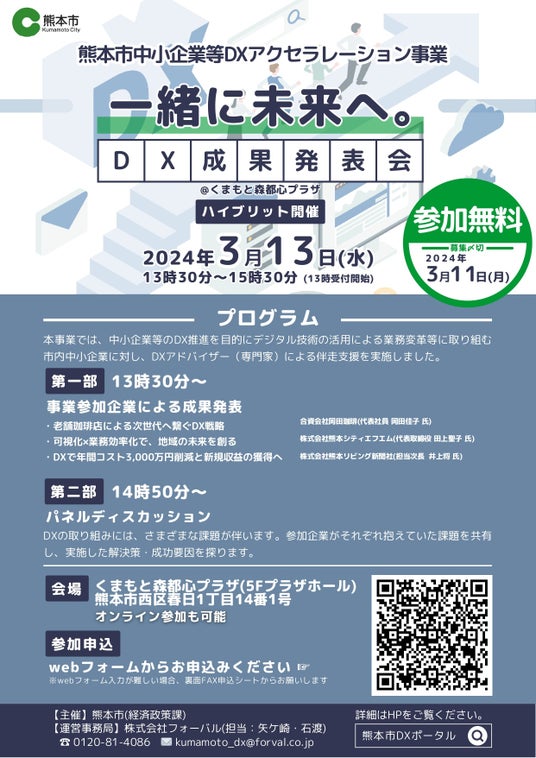 『「新しいあたりまえ」で、新しい世界を創る FORVAL 』を理念に掲げる、次世代経営コンサルタント集団である株式会社フォーバル(本社:東京都渋谷区、代表取締役社長:中島 將典、以下「フォーバル」)は2024年3月13日(水)に熊本県で開催される『熊本市中小企業者等DXアクセラレーション事業成果発表会』の運営事務局を務めることをお知らせいたします。