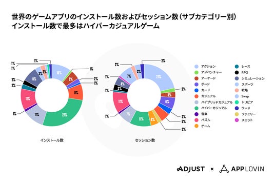 2024年のゲームアプリは、セッション数が前年比0.6%減となったものの、インストール数は4%増となりました。ハイパーカジュアルゲームアプリのインストール数は全インストール数の27%を占め、パズルゲームとハイブリッドカジュアルゲームはそれぞれ11%を占める結果となりました。