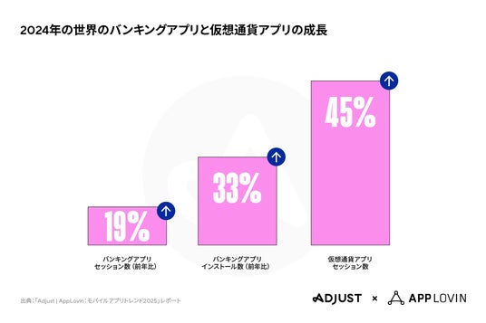 バンキングアプリのインストール数は前年比33%増、セッション数は19%増となりました。仮想通貨アプリのセッション数は非常に大きく伸び、45%増となっています。この貢献によって、2024年のファイナンスアプリ全体のインストール数は27%増、セッション数は24%となりました。