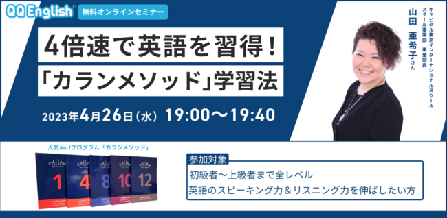 株式会社QQEnglish (本社:東京都渋谷区、代表取締役:藤岡 頼光)は、提供するオンライン英会話サービス「QQEnglish」「QQキッズ」にて、通常の4倍速で英語が習得できると言われている英語学習法「カランメソッド」に関する無料オンラインセミナーを開催します。会員・非会員を問わず、どなたでも参加できる無料のオンラインイベントです。ぜひお気軽にご参加ください!