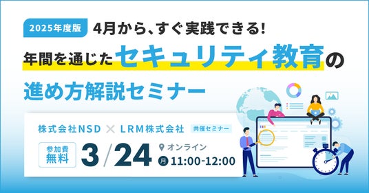 LRM株式会社(本社:兵庫県神戸市、代表取締役CEO:幸松哲也)と、株式会社NSD(本社:東京都千代田区、代表取締役社長:今城義和)は、2025年3月24日(月) 11時から、年間を通じたセキュリティ教育の進め方に関するセミナーを無料開催します。Zoomでお気軽にご視聴いただけますので、ぜひご参加ください。