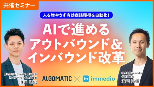 株式会社immedio(本社:東京都港区、代表取締役:浜田 英揮、以下 immedio)は、営業AIエージェント「アポドリ」を提供する株式会社Algomaticと共に、2025年7月24日(木)に無料オンラインセミナー「人を増やさず有効商談獲得を自動化!AIで進めるアウトバウンド&インバウンド改革」を開催いたします。