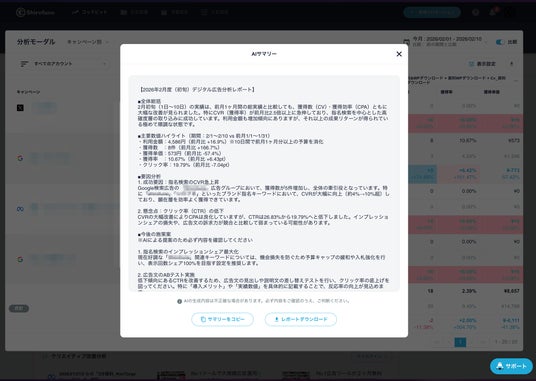 株式会社Shirofune(本社:東京都中央区、代表:菊池満長)は、広告運用自動化ツール「Shirofune」のレポート自動生成機能が生成する「変化分析レポート」で、レポート内の広告パフォーマンス変動の数値や要因、今後の効果的な施策を生成AIが分析し、要点を簡潔にテキストでまとめる「AIサマリー」を提供します。
