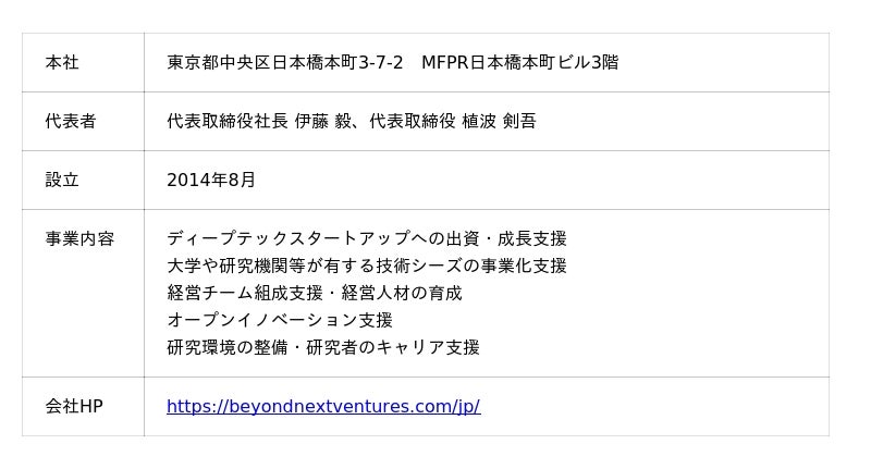 https://serial-founders-deeptech-01.peatix.com/Beyond Next Venturesは、地球規模の社会課題の解決に挑む研究者・起業家とともに、研究成果を社会の価値へとつなぎ、その価値が次の研究と挑戦を生む好循環の創出を目指します。ディープテックスタートアップへの投資に特化した480億円のファンドを運用し、独自のカンパニークリエーション機能、数百名以上の経営人材マッチング、ディープテックに関わる国内外のキーパーソンが集う「TECHNIUM Global Conference」の実施などを通じて、資金・人材・ノウハウを結集し、産学官一体となって研究成果の社会実装を支えるエコシステムの構築を推進します。