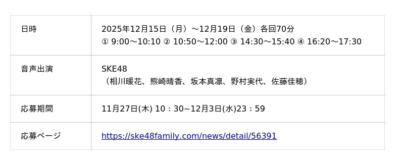本実証実験では、地元アイドル「SKE48」や「BOYS AND MEN」の音声ガイドとともに、名古屋駅を発着点とした主要観光地を約30分かけて巡ります。参加者は、まるで“推し”と一緒に旅しているかのような臨場感あふれる音響体験と、最新のモビリティ技術を同時に体感できます。応募は事前抽選制(応募期間:11月27日(木)10:30~12月3日(水)23:59、参加費無料)で、当選者のみご参加いただけます。本取り組みを通じて、地域の魅力発信と新たな観光体験の創出をめざします。