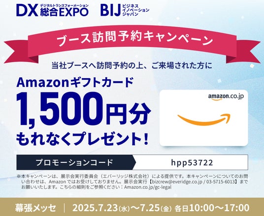 「DX 総合EXPO 2025 夏 東京」へのご来場される際は、ぜひUmee Technologies株式会社のブースへお立ち寄りください。訪問予約をしてご来場いただくと、Amazonギフトカード1,500円がもらえるキャンペーンも実施中です。