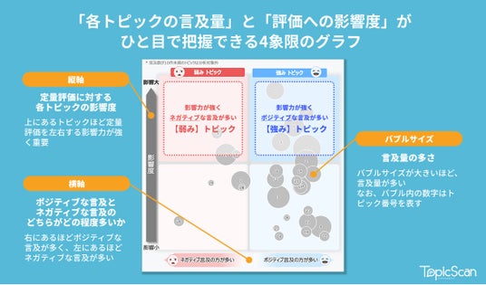 このように、星や点数などの顧客の評価に対して「影響の強い重要トピック」が可視化されます。