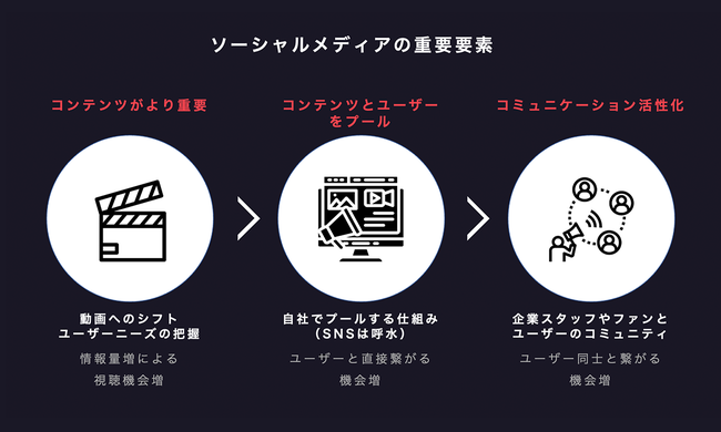 ソーシャルメディアマーケティングにおける重要ポイントは、コンテンツ × コミュニティの組み合わせによりユーザーコミュニケーションが活性化する点です。