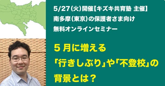 GW明け不登校のお悩みを一挙解決!南多摩・東京に特化した不登校からの進学事情も大公開。主催は不登校のお子さん向けの個別指導塾・キズキ共育塾。参加無料のオンラインセミナー。