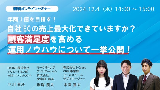 ECサイトの運営代行サービスを提供しているマーケティングアソシエーション株式会社(本社:東京都台東区 代表取締役:中園広和、以下当社)は、2024年12月4日(水)に、ウェブセミナー「【年商1億円を目指す!】 自社ECの売上最大化できていますか? 顧客満足度を高める運用ノウハウについて一挙公開!」を、HATME株式会社、株式会社E-Grantと共催いたします。