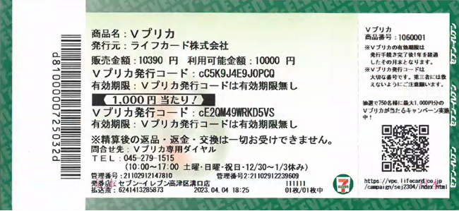 Vプリカ購入後、レジで受け取るチケットに【500円当たり!】等の記載があれば当たりです。