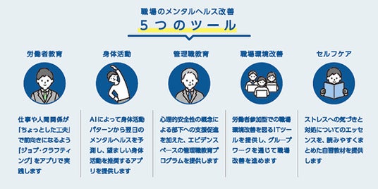 職場のメンタルヘルス改善につながる5つのツールを活用します。