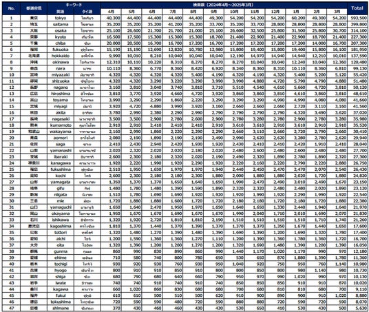 (※)を展開しているアウンコンサルティング株式会社(東証スタンダード市場:2459、本社:東京都千代田区、代表取締役CEO:信太明、以下「アウンコンサルティング」)はこの度、タイにおける日本の47都道府県に関する年間の検索トレンドについて調査を実施しましたので、その結果をお知らせいたします。