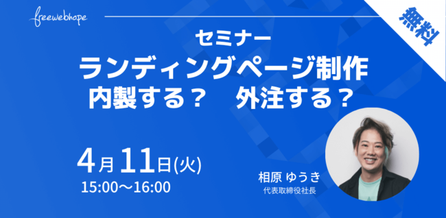 株式会社free web hope(本社:東京都中央区、代表取締役:相原ゆうき)は、無料のオンラインセミナー「ランディングページ制作 内製する?外注する?」を4月11日(火)に開催いたします。(お申込みフォーム: