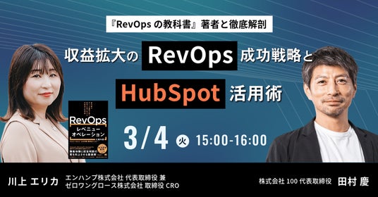 HubSpot Smart CRM(TM)の導入・運用支援サービスを通じてRevOpsソリューションを提供する株式会社100(ハンドレッド、本社:東京都世田谷区、代表取締役:田村慶、以下、100)は、好評を博したウェビナーの追加配信を決定しました。レベニュー組織の生産性向上や人材育成支援を行うエンハンプ株式会社と共催で、「RevOps(レベニューオペレーション)」をテーマとした無料オンラインウェビナーを2025年3月4日(火)に開催いたします。