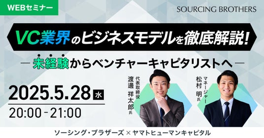 ヤマトヒューマンキャピタル株式会社(本社:東京都千代田区、代表取締役:堀江 大介)は、2025年5月28日(水) 20:00よりオンラインにて、ソーシング・ブラザーズ株式会社 代表取締役 渡邊 祥太郎 氏、マネージャー 松村 明 氏にご登壇いただくウェビナー『VC業界のビジネスモデルを徹底解説!』を開催いたします。