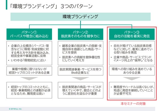 10年にわたり企業のブランディングをご支援してきたバイウィルでは、環境への取り組みをブランド価値に繋げる「環境ブランディング」として大きく3つのパターンが存在すると考えています。