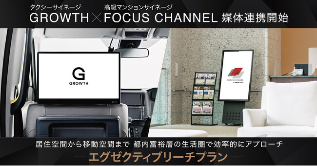 この度、当社が運営するタクシーサイネージメディア「GROWTH」とニューラルマーケティングが運営するマンションサイネージ「FOCUS CHANNEL」の媒体連携を開始することをお知らせします。都内の富裕層にリーチ可能な双方のメディア特性を最大限に活かし、新しいマーケティングソリューションを提供することを目的として、本提携に至りました。