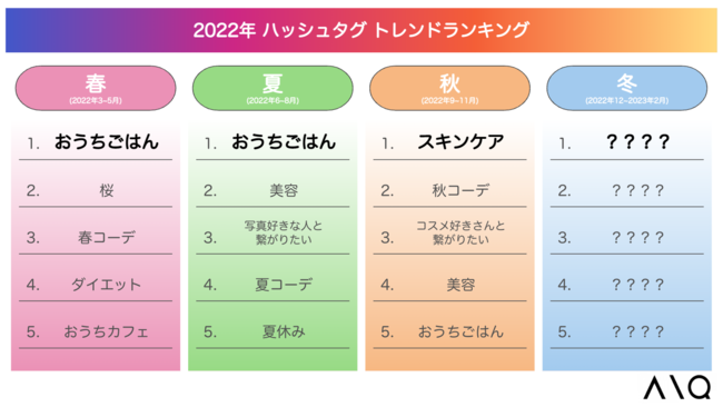 AIを活用したInstagramのマーケティング支援を行うAIQ株式会社(本社:東京都新宿区、代表取締役社長 渡辺求、以下AIQ)は、2022年の春から秋にかけてInstagramで流行ったハッシュタグを調査した「2022年春~秋のハッシュタグトレンドランキング」を公開しましたのでお知らせします。本ランキングは、AIQが独自に開発したAI分析システムをもとにInstagram内のフィード画像やリール動画などで投稿された内容を分析し、2022年3月~11月の期間、調査しています。