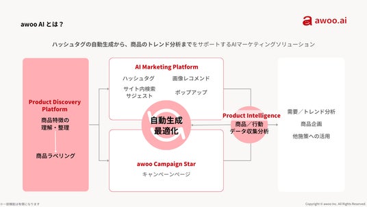 まず、Product Discovery Platformでは、AIがデータフィードの情報をもとに商品特徴の理解・整理を行い、商品をラベリングします。そして、AI Marketing Platformを通じてハッシュタグをサイト内に表示・随時最適化し、画像レコメンドやサイト内検索のサジェスト機能を提供します。さらに、新たに加わったawoo Campaign Starでは、商品データと顧客の行動データを組み合わせ、簡単に魅力的なキャンペーンページを作成・最適化することで、売上の最大化を図ります。これらの施策により得られるデータを、Product Intelligenceによって、収集・分析を行い、得られたインサイトを様々なマーケティング施策に活用することが可能です。