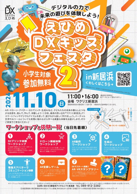 愛媛県のラジオ放送局 株式会社エフエム愛媛(本社:愛媛県松山市/代表取締役社長 倉渕秀俊)は、愛媛県松山市でデジタルハリウッドSTUDIO松山を運営する株式会社さくら印刷(本社:千葉県茂原市/代表:鎌田俊郎)と共同で、愛媛県が推進する「地域DX実践支援業務」の一環として『未来の遊びを体験しよう!えひめDXキッズフェスタ2 in 新居浜』を開催します。