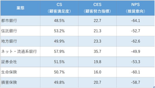 調査ではそれぞれの金融機関の利用者にCSのほか、近年ロイヤルティー指標として注目されているNPS、CES(Customer Effort Score 顧客努力指標)など多角的な項目について評価を聴取しており、評価した理由も自由記述で質問しています。