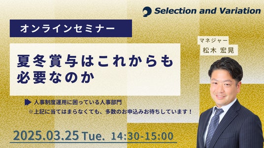 https://sele-vari.co.jp/ )は「夏冬賞与はこれからも必要なのか」セミナーを2025年3月25日(火)14:30~15:00に開催することをお知らせいたします。