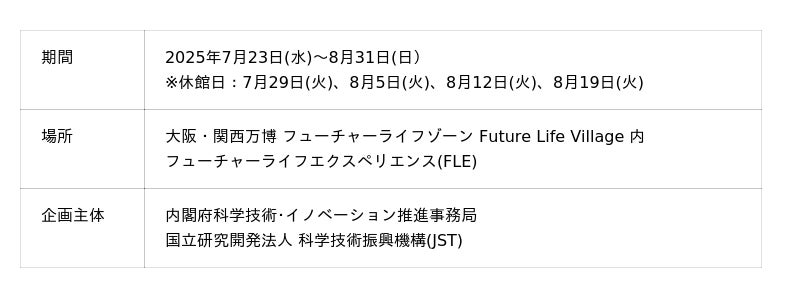 ムーンショット型研究開発制度は、日本発の破壊的イノベーションの創出を目指し、従来技術の延長上にはない、より大胆な発想に基づく挑戦的な研究開発(ムーンショット)を推進する、国の大型研究プログラムです。今回の展示では、ムーンショットが提示する10の目標をもとに、未来の研究成果を直感的に体験できる14の展示企画を、週替わりで展開します。今回の展示では、ムーンショットの10の目標に紐づいた15の展示企画が、週替りで順次公開されます。それぞれの展示では、未来に向けた研究成果がわかりやすく可視化され、「見て・触れて・感じる」体験を通じて、来場者と未来の問いを共有することを目指しています。