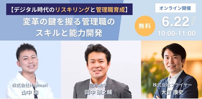 株式会社Hajimariあらゆる人の自立を創造する企業、株式会社Hajimari(所在地:東京都渋谷区、代表取締役:木村 直人)は、運営するHR Universityにて、デジタル時代のリスキリングと管理職育成をテーマにしたオンラインセミナーを開催することをお知らせいたします。